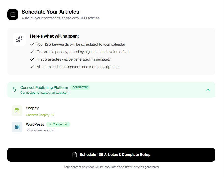Connect your site through Shopify, WordPress, or Webhooks then forget about it. Ranktack automatically publishes fresh content to your website every single day on complete autopilot.